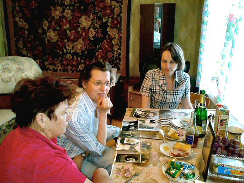 Am Tisch bei Baba Ljuba (Ljubov Vasiljevna Andreeva, 86) Von links: Tatjana Baranova, Sozialarbeiterin von “Sostradanie”, Brigitte Gensch, Marlis Martin